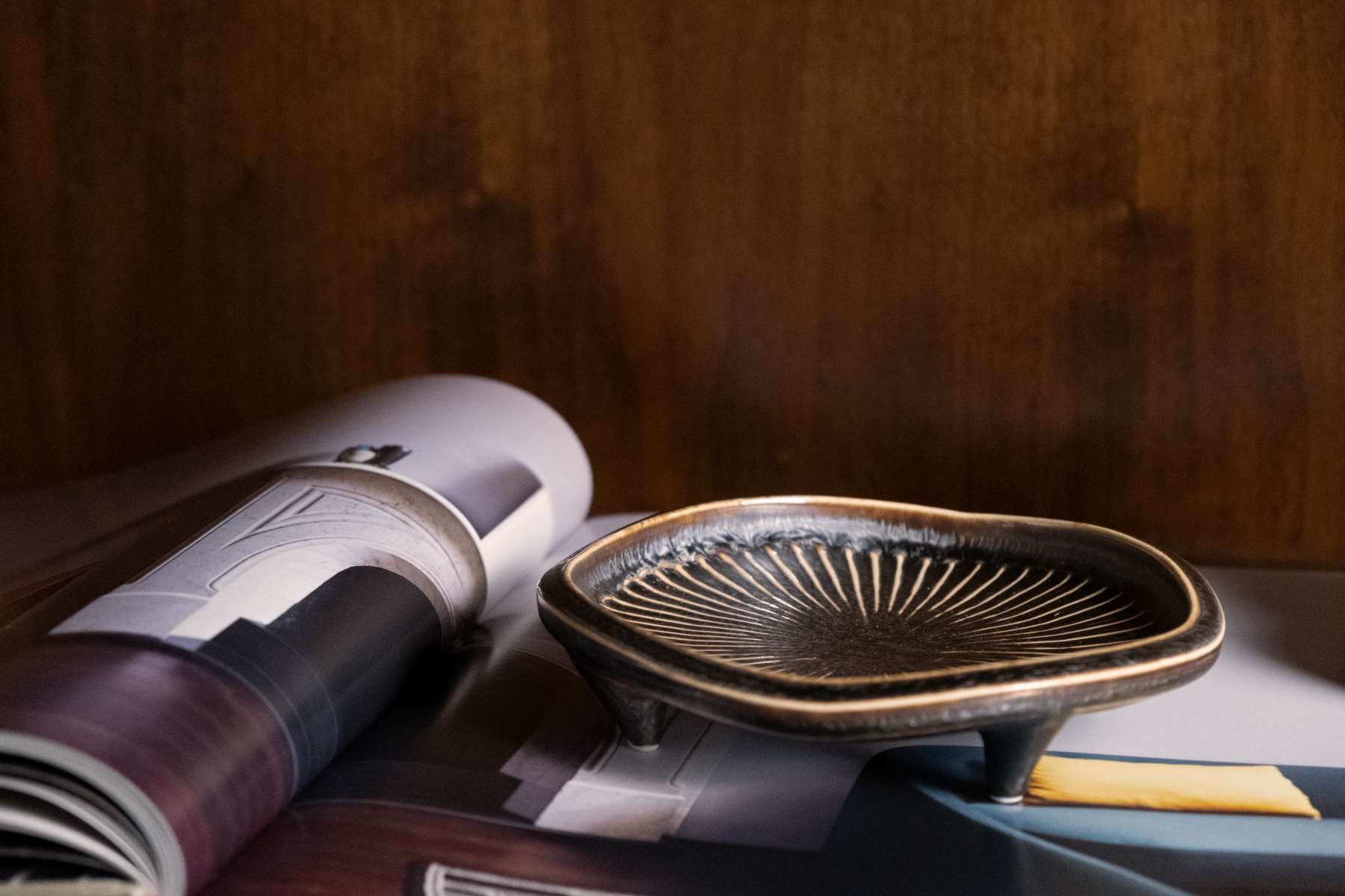 The Shigaraki Footed Plate is designed as a study of the sea urchin. A subtle matte glaze with intricate hand textured linework on the face of the plate. The Shigaraki Footed Plate is great as shared dinnerware or as a catchall on a console. Versatile and iconic. Crafted in Gifu, Japan.